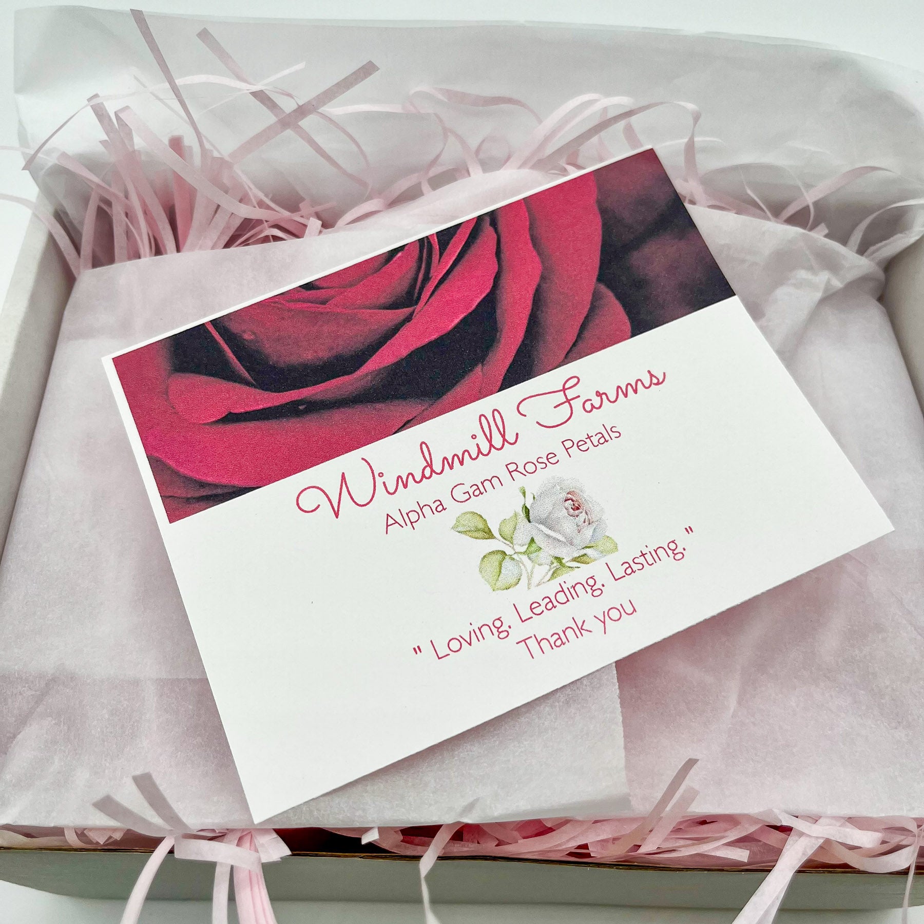 All three special Alpha Gam formulated items are scented with Rose Petal essential oil, boxed with white tissue paper, red and white crinkle paper and a special card. Ready for your big or little, or maybe, just to let them know you’re loving, leading and lasting.